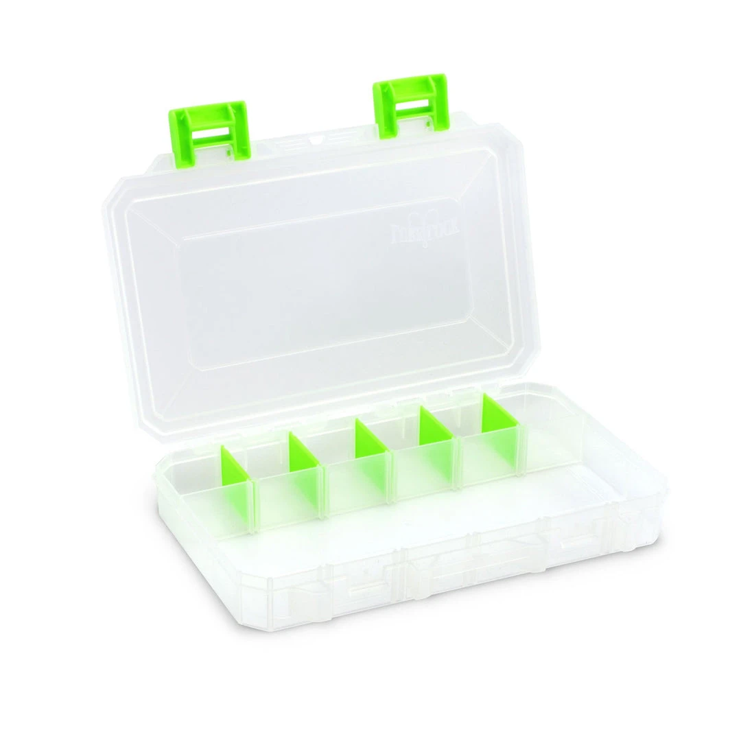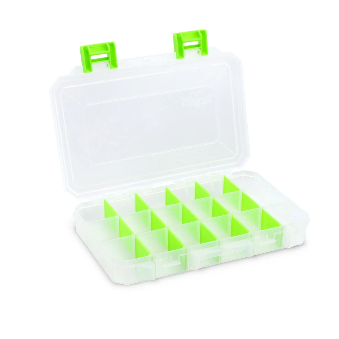 Our medium box has optional permanent dividers, creating one, two or three long compartments. The tackle box features clear plastic, sturdy yet easy-to-open green latches, and comes with Snap-Apart Dividers so you can customize your tackle box.