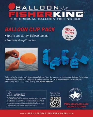 Balloon Clip Pack includes 5 Heavy Mono Balloon Clips. Recommended for use with Balloon Fisher King biodegradable, 100% latex balloons. The clips are recommended for 150-lb monofilament line and higher. Balloon clip will not cut or nick fishing line. Patent Pending.