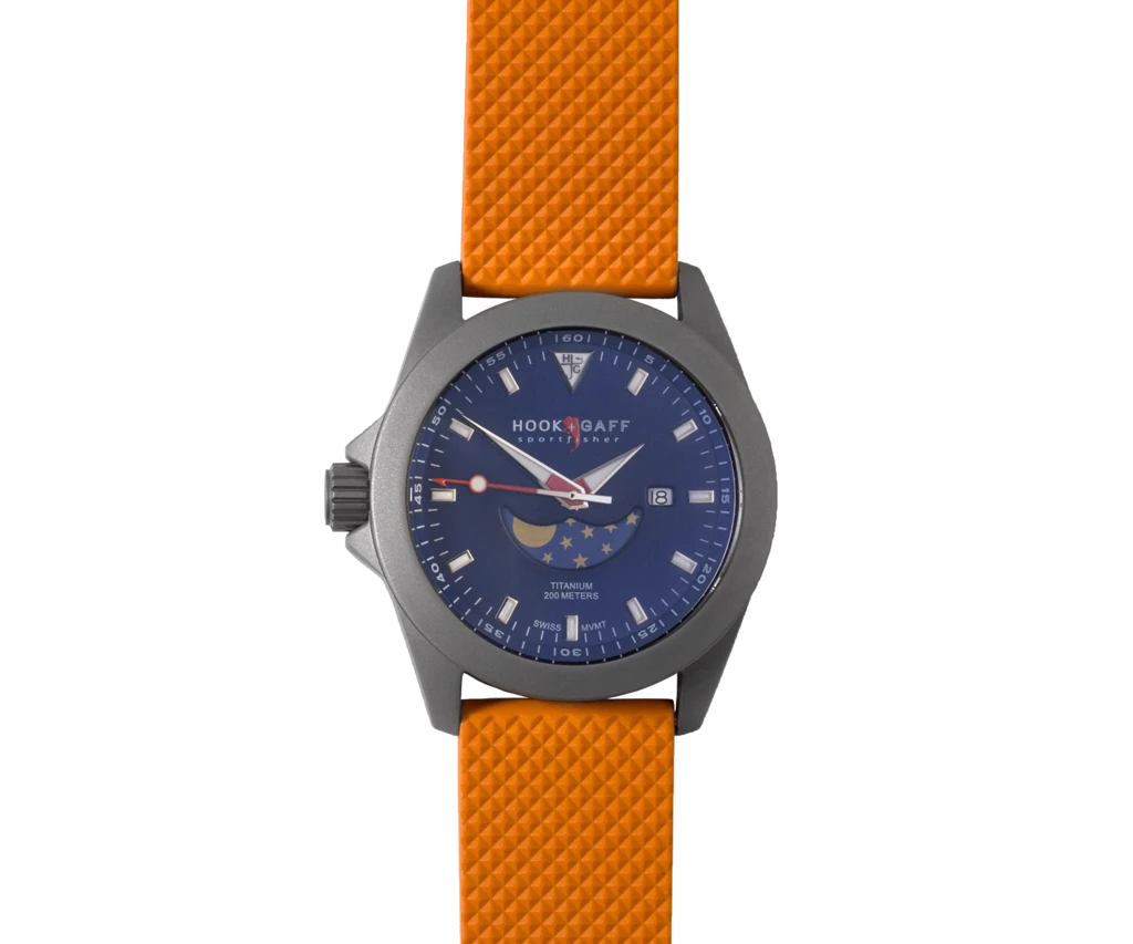 The new Sportfisher II Blue Dial Moonphase watch houses a custom Swiss quartz movementย withย moon phase and date. The crown is uniquely placed on the left side of the watch face to avoid irritation during active angling situations. The titanium case is corrosion-and-water-resistant, in addition to being a poor conductor of heat for those hot days on the water.ย ย Specifications include: