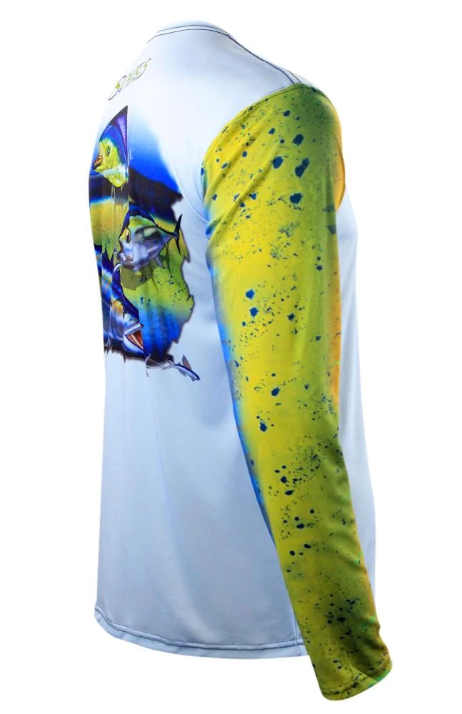 Our youth Offshore Slam Sun-Shield Long Sleeve is uniquely designed and built to help you thrive under extreme conditions. Featuring up to UPF +50 solar protection and powered by PURE-tech™ moisture wicking technology. The art displays a combination pattern of Wahoo, Mahi and Tuna scales and is dye sublimated, so you don’t have to worry about fading, or peeling.
