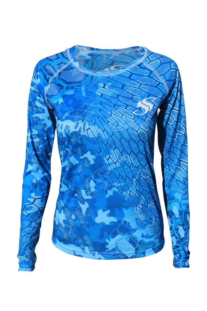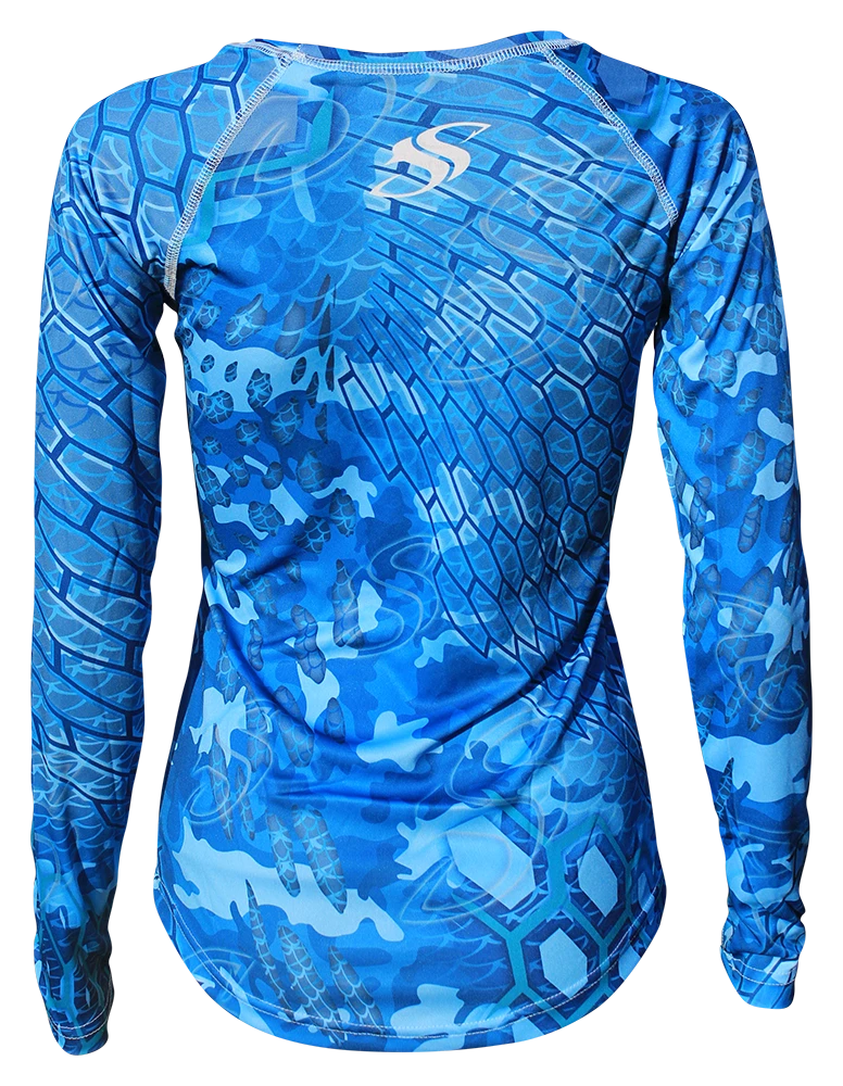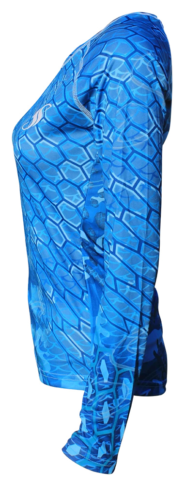 The new ladies blue cycloid pattern is an elaborate mix of wild scale and camo patterns that truly stand out while keeping you protected on the water. The performance longelseeve is made with PURE-tech™ moisture wicking technology and a UPF +50 Solar Protection rating. Perfect for fishing, the beach or working out.